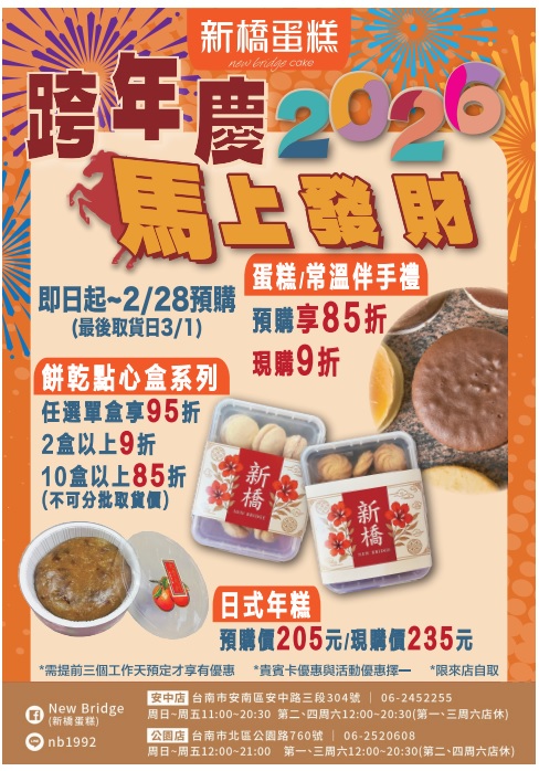 🎉 新橋蛋糕|跨年慶 2026 馬上發財 🎉 新的一年,從甜甜的好兆頭開始 🧧✨ 🎁 過年送禮、拜訪親友、公司團購都適合 讓【新橋蛋糕】陪你一起 馬上發財、好運一整年! 💰✨ 新橋LINE ID : nb1992(回覆時間:一~五0800~1700)